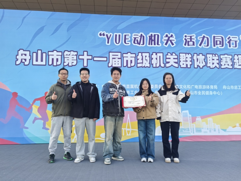 2025年11月25日下午,“YUE动机关 活力同行”舟山市第十一届市级机关群体联赛趣味体育比赛在舟山体育场圆满举行。中心代表队方品杰、费晨新、王莎莹、周晗宇、黄丁宁等五名选手在比赛中团结一心、奋勇争先,经过激烈角逐,最终荣获三等奖,充分展现了中心青年科研人员朝气蓬勃、紧密协作、敢拼敢赢的精神风貌与团队凝聚力。